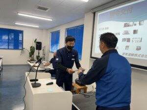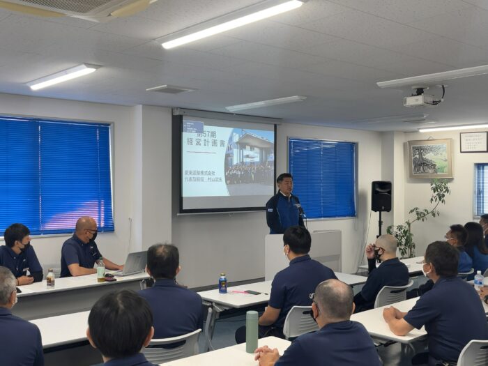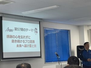 社長の経営計画発表の後は第57期のテーマも発表されました!第57期テーマは「感謝の心を忘れずに、磨き続けるプロ意識、未来へ続け愛と技」となりました。まずは全ての事に感謝の気持ちを持ち続ける事から始まります。お仕事がある事への感謝の気持ちがあれば自ずとより良いサービスの提供の為にとプロ意識も高まります。私達愛東社員は人間力と技術力である「愛と技」を磨き続けお客様から愛され続ける企業を目指して参ります!
