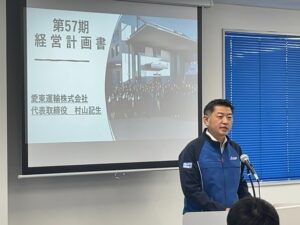 来週水曜日より、いよいよ第57期が始ります!スタートを目前に第57期における経営計画と組織改革について村山社長より発表がありました!会社を盤石にする為には品質を今以上に高め、完璧なサービスをお客様に提供しなければなりません。不具合が起きない人は起こさない努力をしている人です。愛東社員はプロドライバーとしての意識を高く持ち、お客様の立場で物事が考えられるプロ集団でなければなりません。新期も皆で力を合わせ、より良い一年と致しましょう!