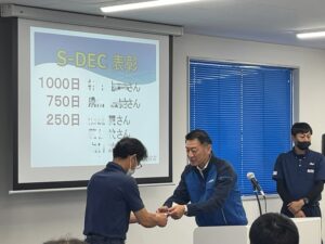 続いてSDEC運動の表彰まで行われました!今回は無事故無違反無クレーム1,000日達成者が1名、そして750日達成者1名、250日達成者3名の計5名が表彰を受けました!冒頭の社長挨拶でもお話がありました「事故を起こさない人は事故を起こさない努力をしている」を愚直に実践してきた結果と言えます!このまま無事故記録を伸ばし続けお客様への限りないサービスの向上に努めて参ります!