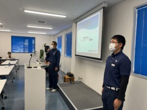 最後は塾長から新たな仲間の紹介がありました!先輩社員を前に緊張しながらも一生懸命に挨拶を行う姿がとてもフレッシュでした!挨拶の後は他の新人達と一緒に「行動力基本動作十ヶ条の審査」も行いました!新人プログラムを見事にクリアにし今後の活躍に期待です!