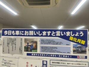 そして今月は「今日も車にお願いしますと言いましょう」強化月間となります!毎日の業務に欠かせない一番の道具といえばトラックです。一日の始まりにトラックに乗車するときには「今日もお願いします!」の一言と終業時には「今日もありがとうございました!」と伝える事で道具への感謝の気持ちを高めます。周りの人たちへの感謝の心と同時に毎日の仕事のパートナーでもある車両への感謝の気持ちを持ち続ける事がより良い仕事をする心持ちの基盤となります!