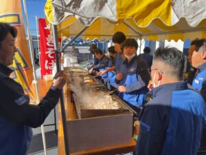 例年通り出店や準備、すべてが愛東社員の手作りです!午前10時開始に合わせ、お客様が来場された時には暖かい食事が提供できるようにと早朝から社員総出で仕込みに精を出していました!焼きそばや各種鉄板焼き、焼豚丼やカレー、その他にも揚げ物やたこ焼き、デザートまで盛りだくさん!すべてが無料で提供されるので出店の前には常に人だかりが出来ていました!