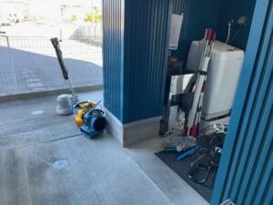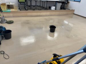 まずは休憩室の清掃から!テーブルや椅子を片付け、床一面にプロ用の薬剤をひろげて磨く事で汚れや擦りキズが見る見ると落ちていきます!その後も手際良く拭き取りやワックスがけも行っていただきました!約三時間ほどで事務所棟のすべての清掃が終了いたしました!