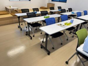 清掃が終わった後の休憩室がこちらです!日々の拭き掃除では取れなかった頑固な汚れもすべて落ちて綺麗になりました!ワックスがけもしかっりと効いていて天井の照明が床に反射するほどピカピカの仕上がりとなりました!この状態を出来る限り維持できるように普段からの清掃にも力を入れて取り組んで参ります!