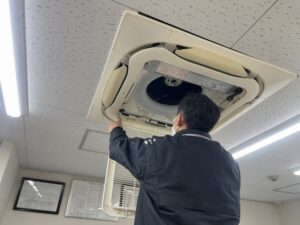天井に設置されているエアコンの清掃も徹底的に行われました!夏場の猛暑や冬の寒い時期でも快適に事務仕事が出来るのはエアコンが正常に稼働してくれているからです。自分たちが働ける職場への感謝の気持ちをカタチにするのが大掃除でもあります!