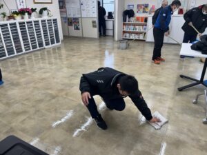 隣の点呼場では机をすべてどかしてから洗剤で床を磨き、更にワックスをかけていきます!毎朝出勤して活力朝礼を行うスタートの地でもある点呼場にも感謝の気持ちを持って清掃活動に取り組みます!そんな思いで清掃を行っていると床を磨く手にも自然と力が入ります!