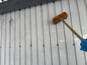 屋外では倉庫の外壁掃除も行われました!こちらは外気に晒されている分、かなりの汚れが付着していました!洗剤をかけながらデッキブラシで磨くことで徐々に白さが戻ってきました!普段の清掃では中々出来ない所まで綺麗にできるのが大掃除の醍醐味です!一時間ほどかけて磨き上げ、綺麗になった外壁を見て大満足でした!