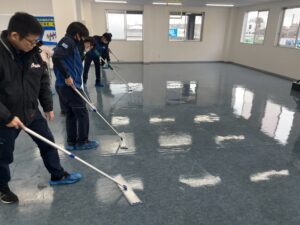 そして私達愛東社員の学びの場である研修棟では事務所と同様に床のワックスがけが行われていました!チームメンバーが一列に並んでムラなく綺麗にワックスをかけて行きます!人生の中で多くのことを学べる場所が職場ですが、その中でも学びに特化した場所でもある研修棟への感謝の気持ちも忘れずにピカピカに磨き上げます!