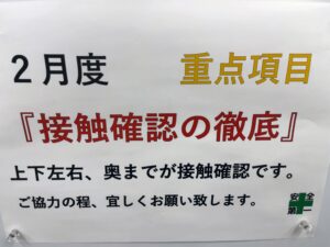 また、2月の重点項目として「接触確認の徹底」をテーマにこの一か月間業務に取り組んで参りました。リフト製品事故のほとんどが確認不足によるものです。トラックの荷台から製品を卸す際、技量に任せてながら作業になっていないか?隣接製品との接触は無いか?奥の荷物の干渉は無いか?少しでもあやしければリフトから降りて確認する。これだけで随分と事故は減ります。愛東運輸では毎月重点項目を掲げ品質の向上に努めています!